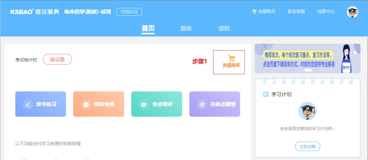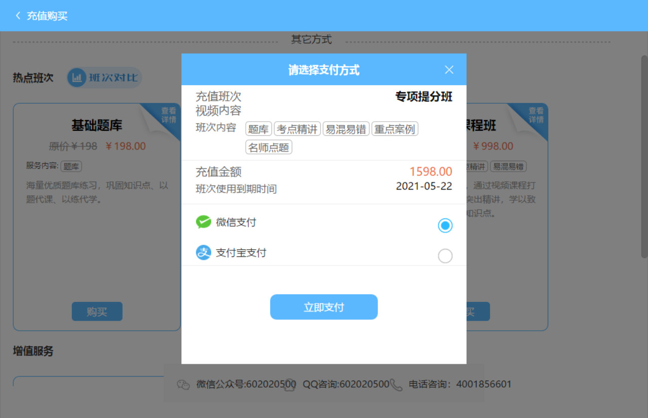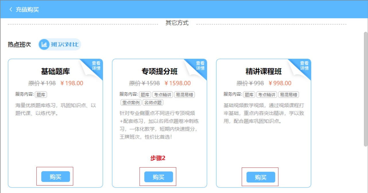 點擊“充值購買” → 進入“班次對比”,根據您個人的需求,選擇適合自己的輔導班次。確定好班次后,點擊“購買”。